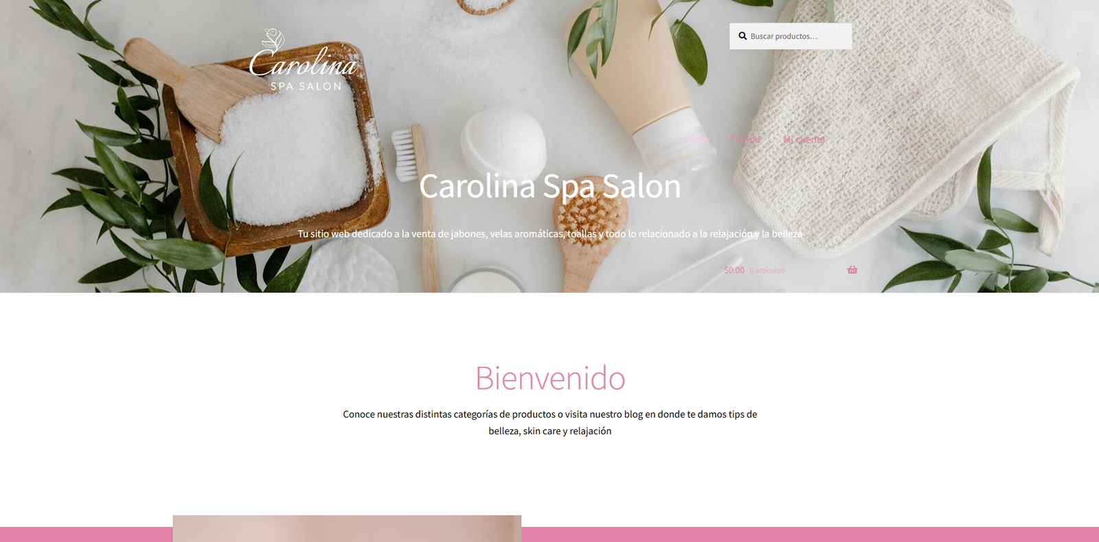 Carolina Spa es un sitio web creado con WordPress y modificado con un tema hijo con PHP y CSS. Es un sitio de comercio electrónico donde puedes comprar productos cosméticos como toallas y jabón.