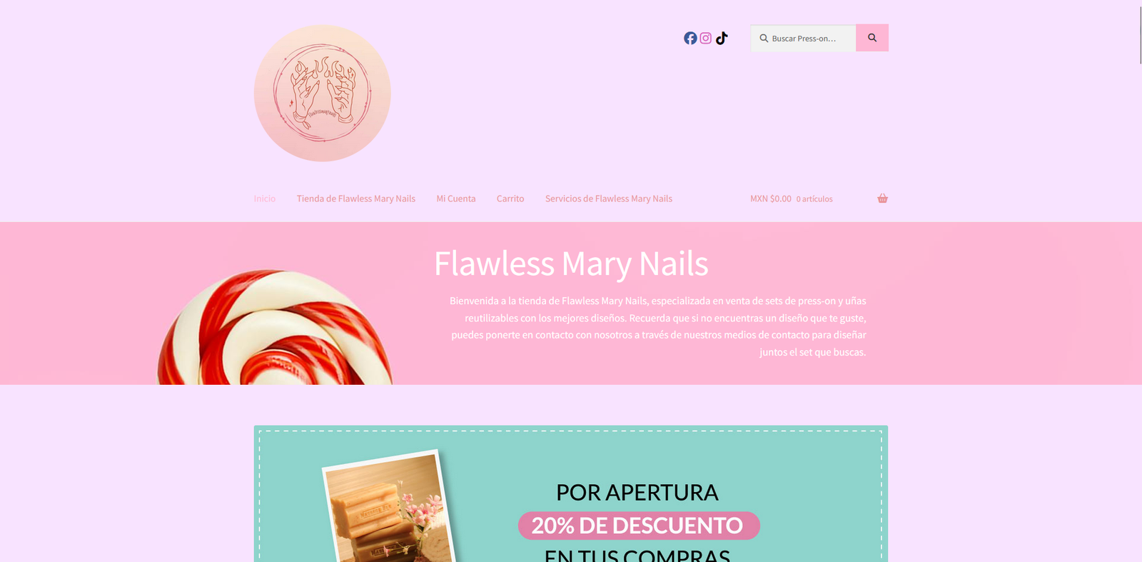 Tienda en línea del sitio web Flawless Mary Nails, sitio web enfocado en manicura y belleza desarrollado en WordPress y WooCommerce.